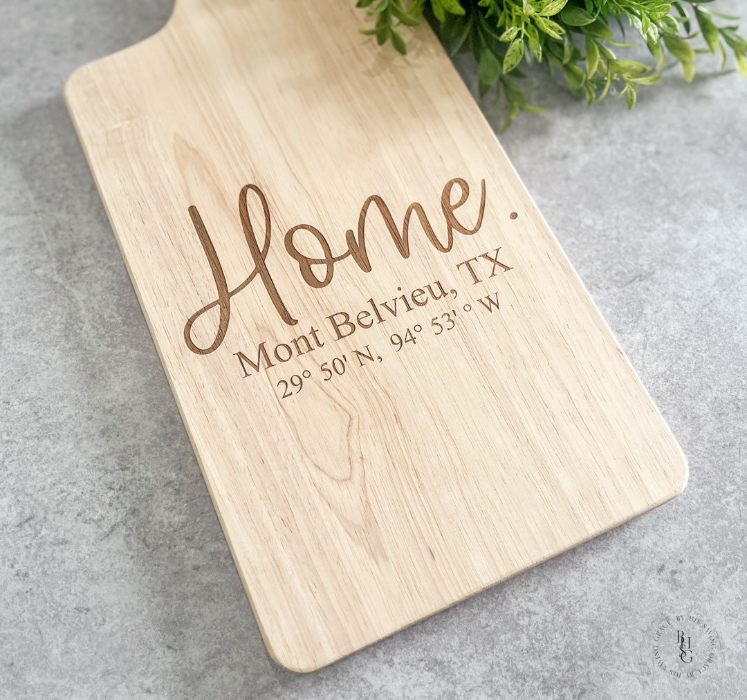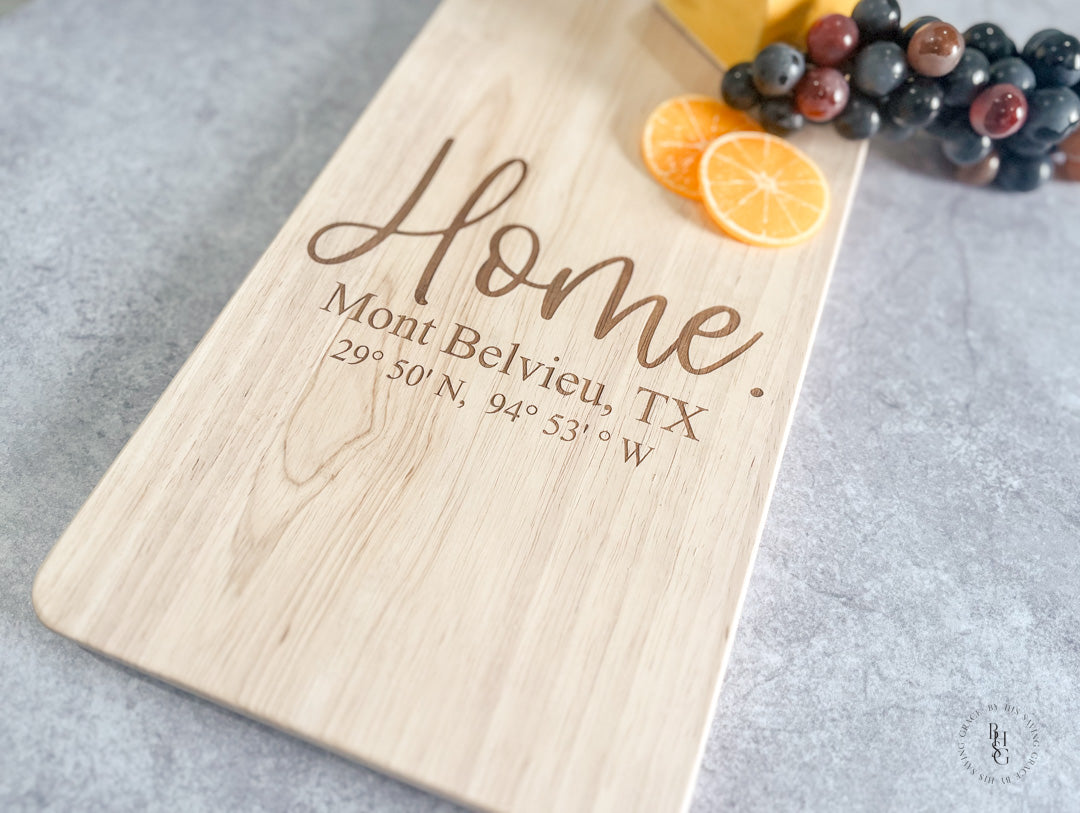 Our laser-engraved wooden serving board is engraved with the word Home, the city, state, and GPS coordinates! This board can be used to serve cheese, hors d'oeuvres, appetizers, and desserts. This custom serving board is a perfect gift for a housewarming gift, client gift, or wedding gift, to name a few.