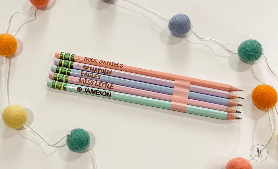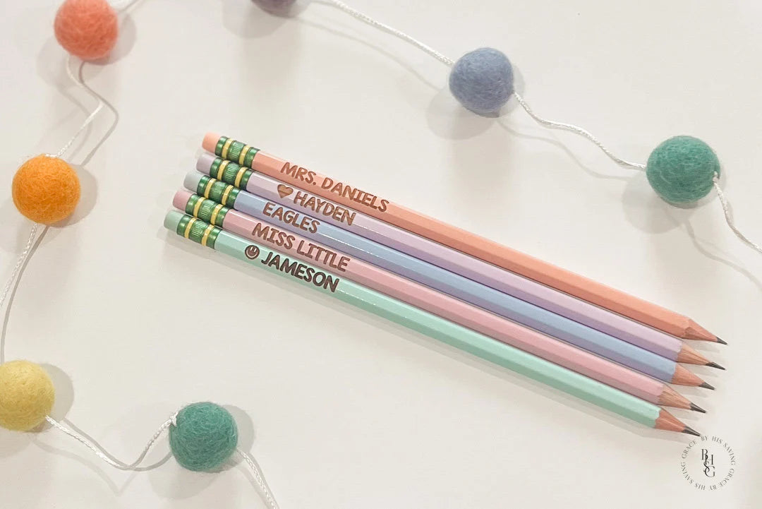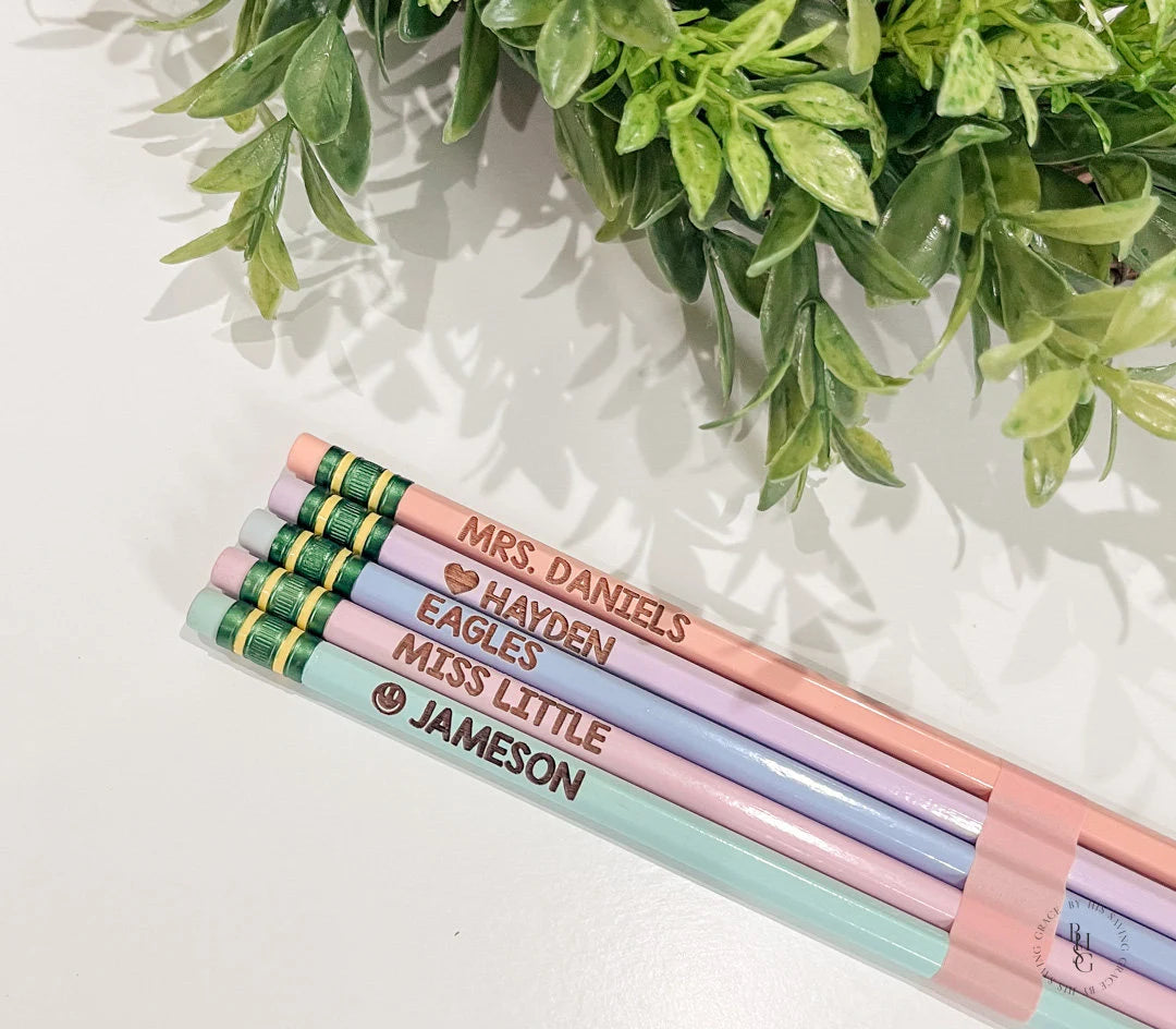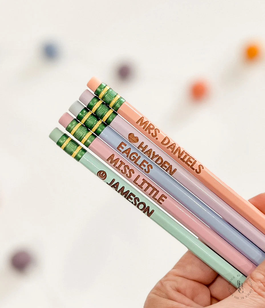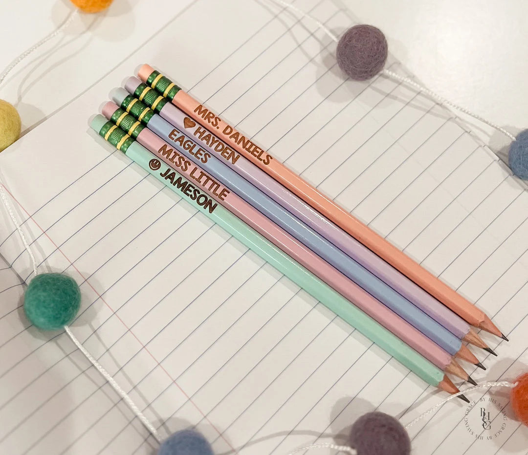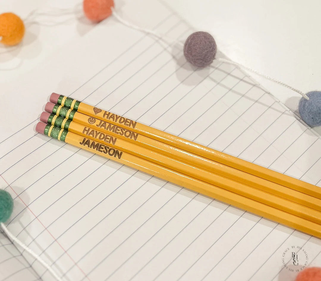 Our laser engraved pencils are personalized with your name of choice! We can do a name, a teacher's name, or a school mascot! Whether you're a student or simply someone who likes personalized stationery, these pencils are for you!