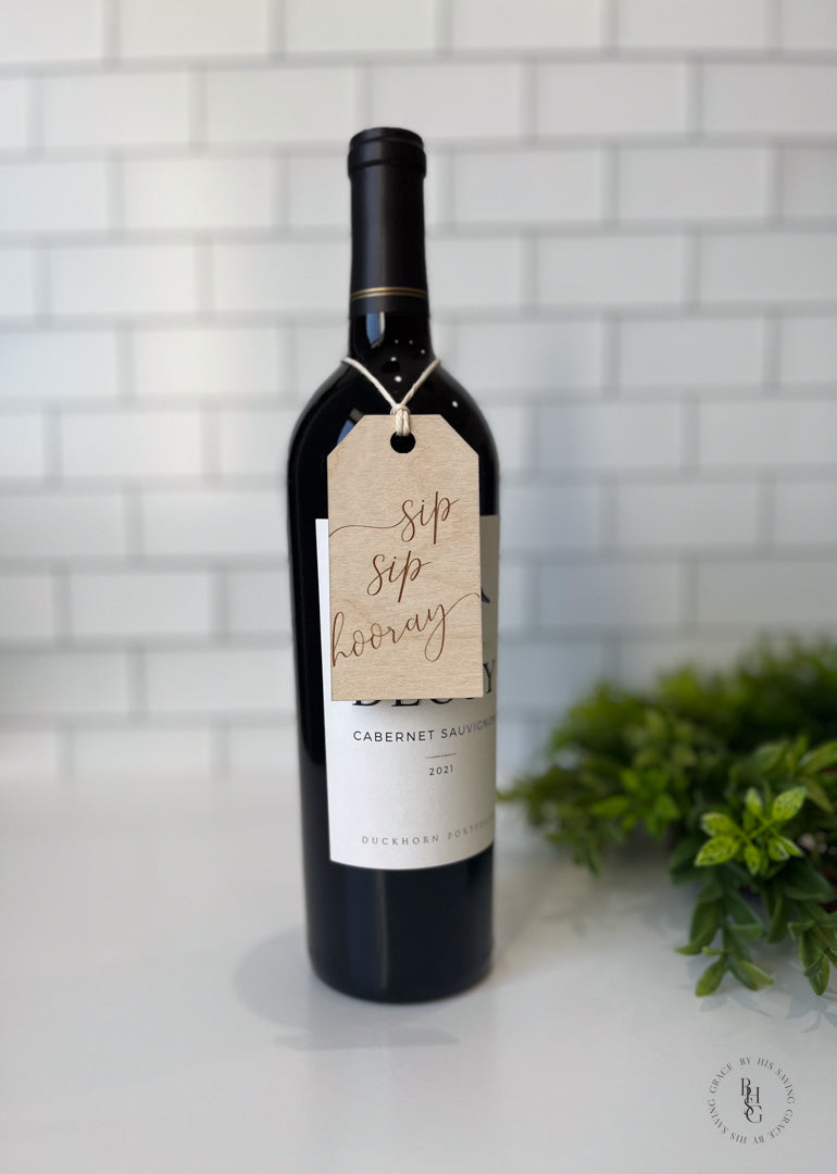 Our laser engraved "sip sip hooray" wooden tag is the perfect addition to any bottle!