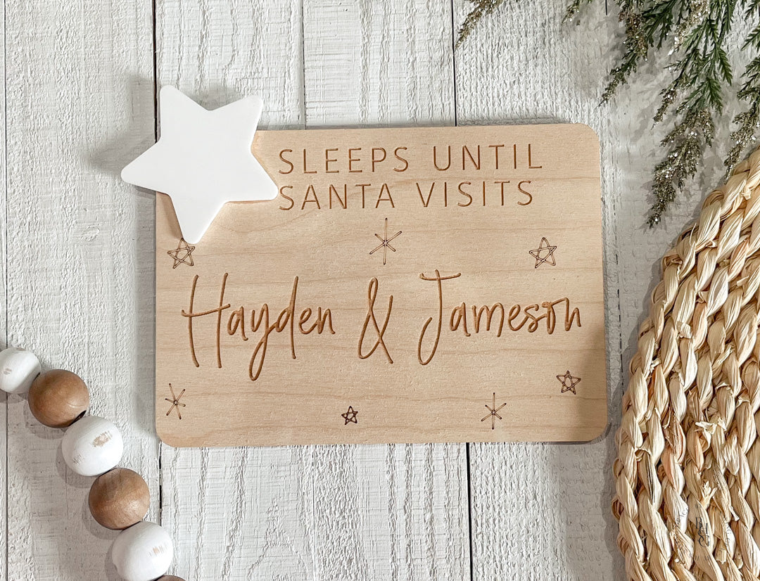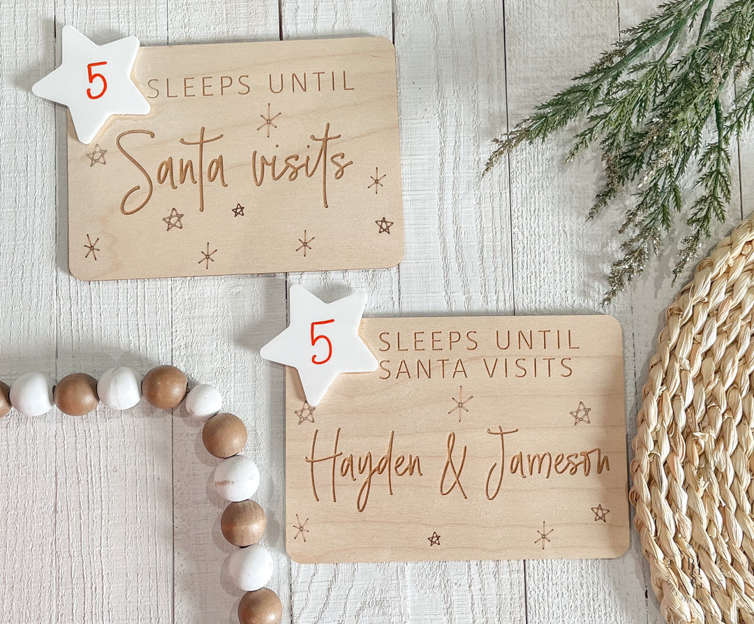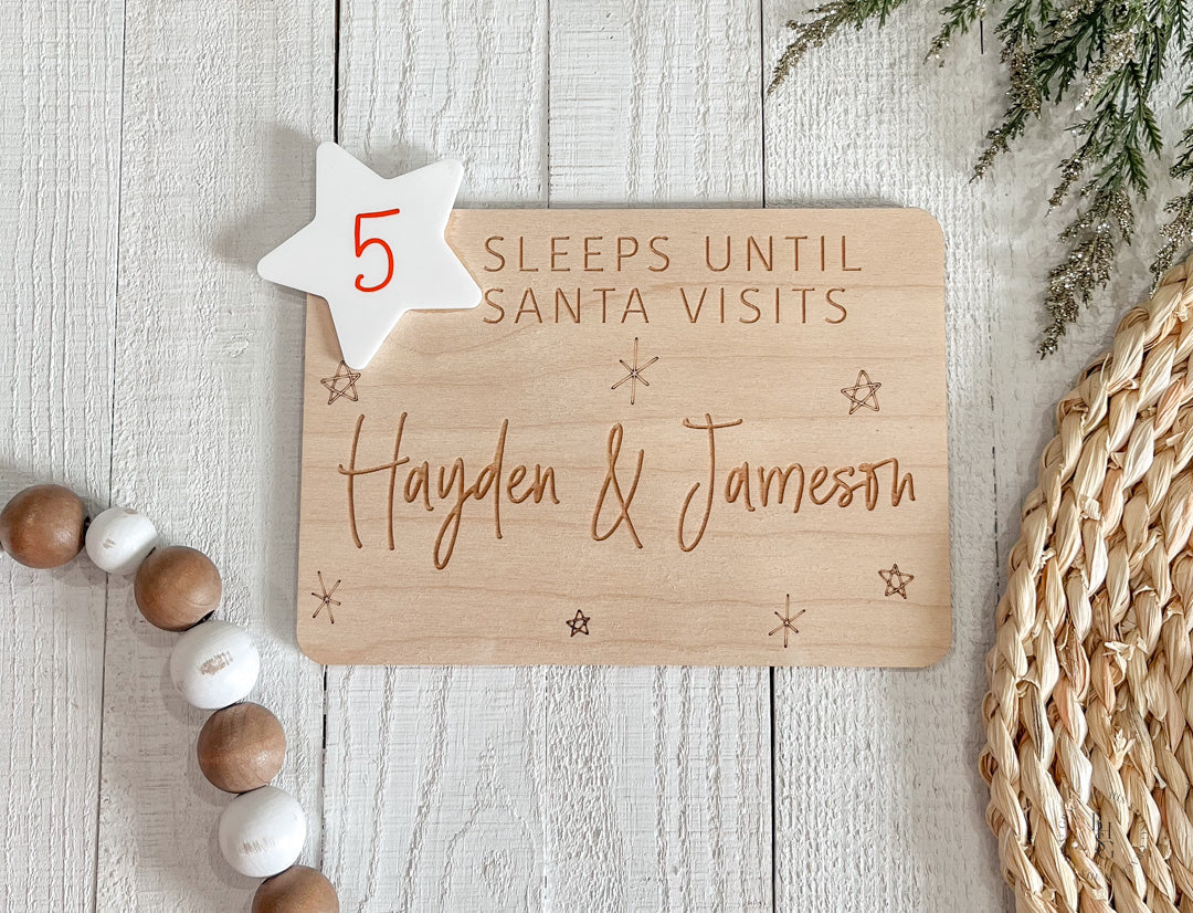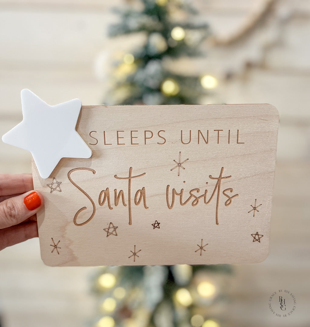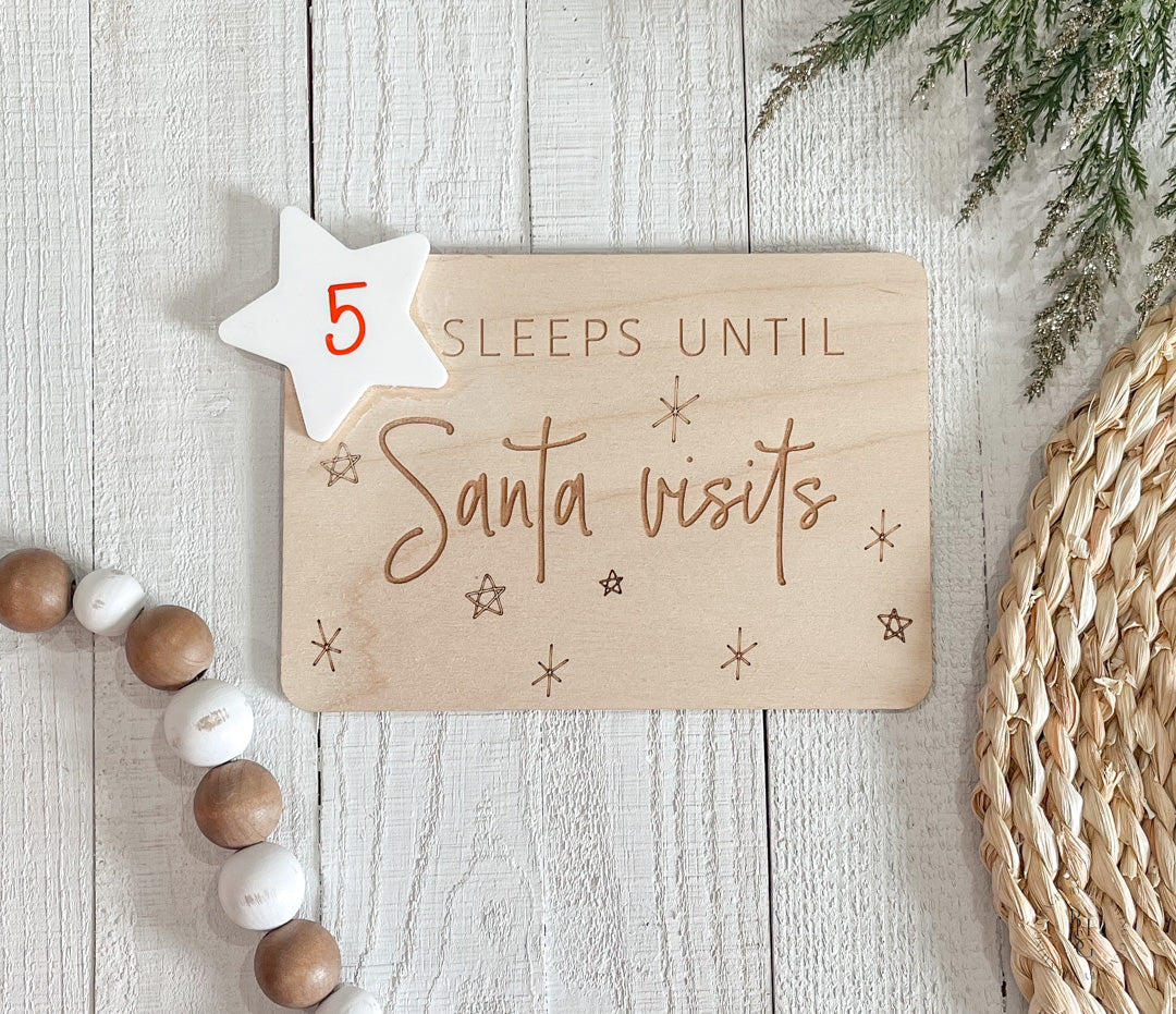 Bring some Christmas cheer to your home this holiday season with our adorable Sleeps Until Santa Visits Countdown Sign. Our Sleeps Until Santa Visits sign features acrylic that doubles as a dry-erase board, making it easy to keep track of sleeps until Santa! Write on the acrylic using expo markers and wipe off the acrylic with a damp cloth or dry-erase board cleaner when ready!