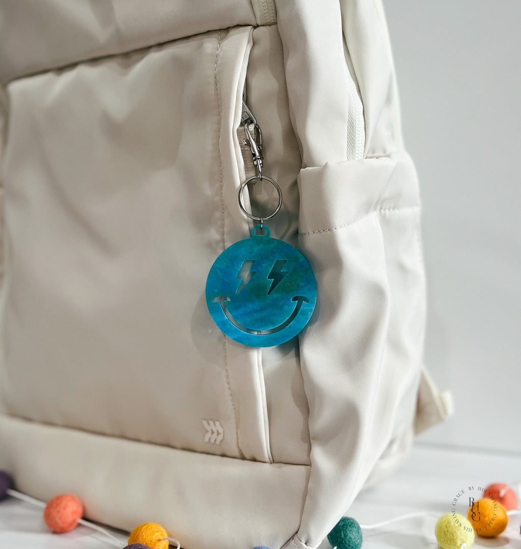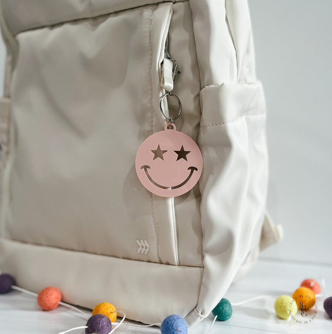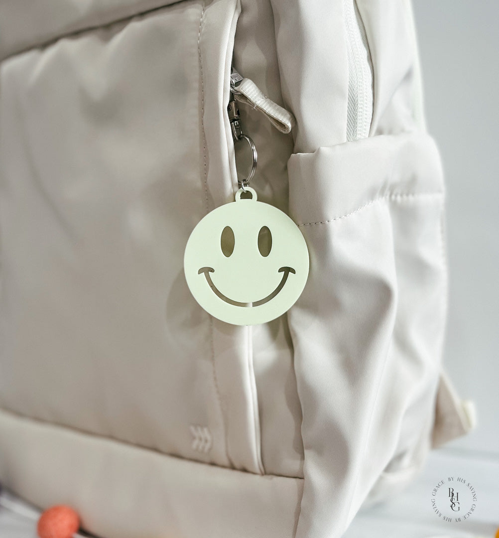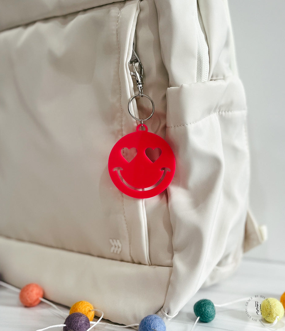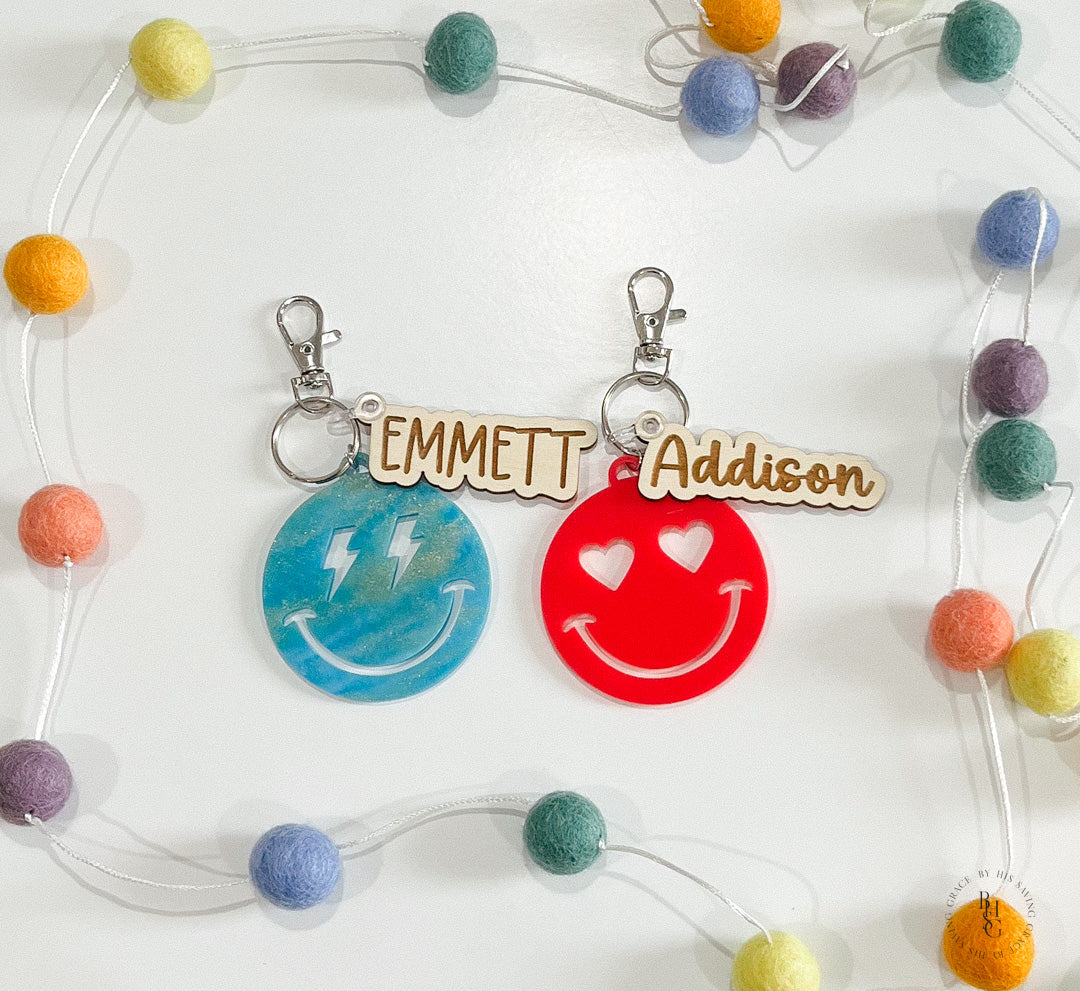 Our laser cut smiley face acrylic keychain with a laser engraved wooden name of choice is the perfect addition to any bag! Available in multiple vibrant colors, it's the perfect accessory to add a pop of color and personality to your keys or bags. Made from high-quality acrylic, this keychain is stylish and durable.