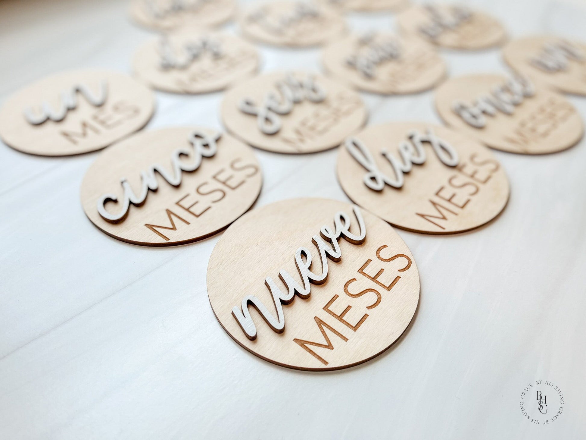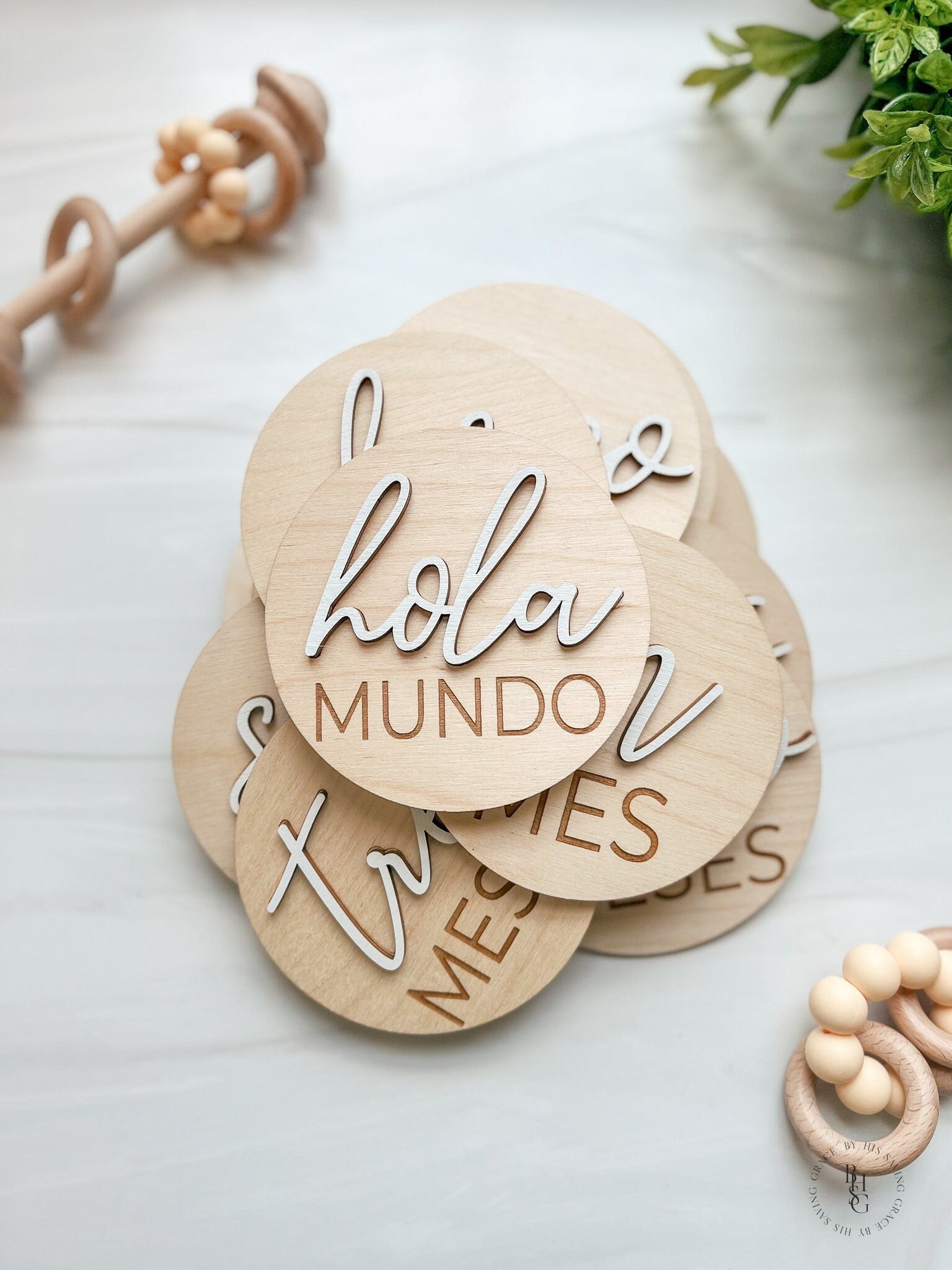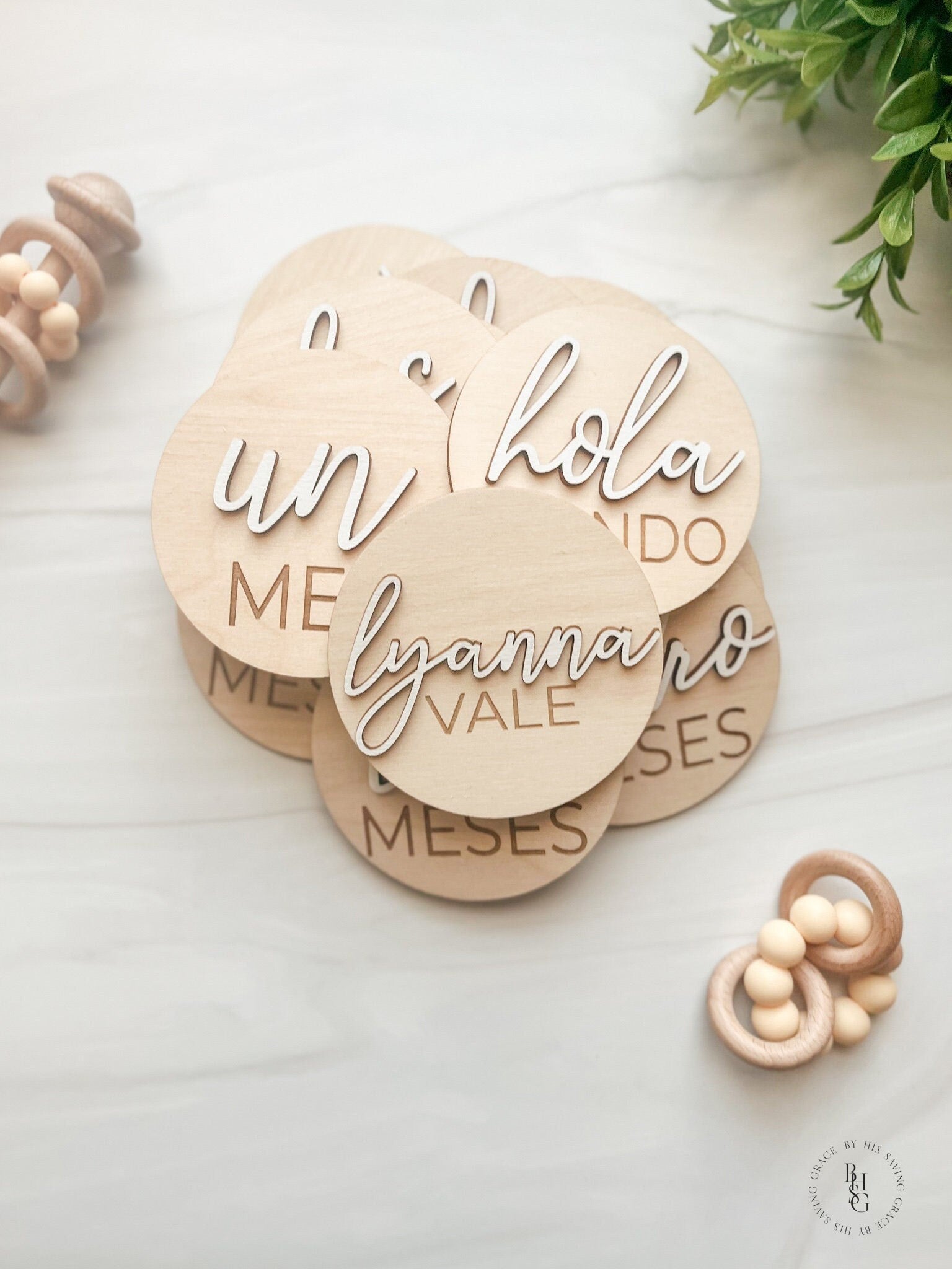 Spanish 3D Wooden Monthly Milestone Discs For Baby Photos + Matching Nameplate