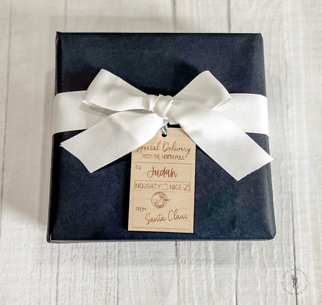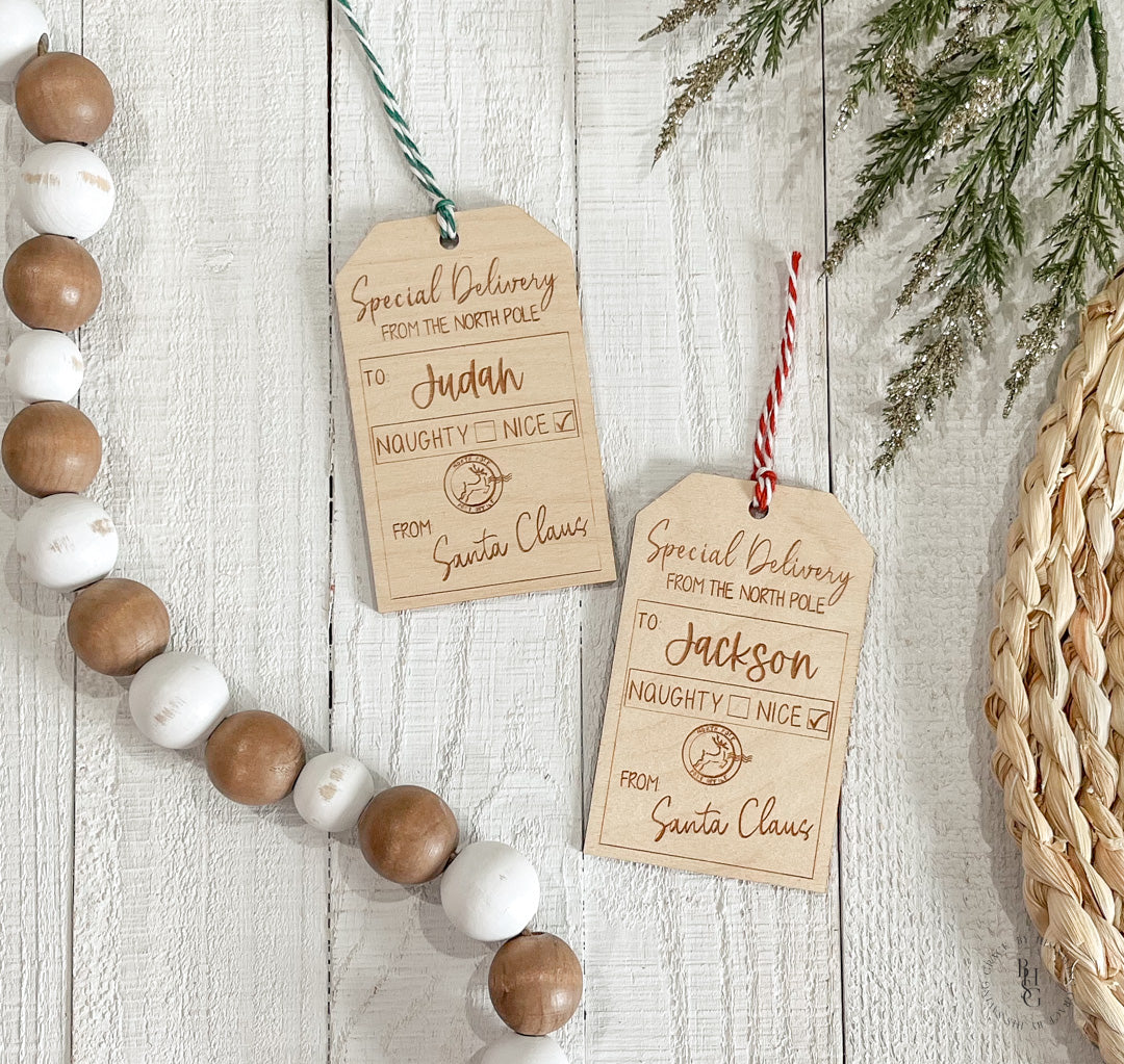 Add a special touch to your gifts with our laser engraved Special Delivery gift tag. Personalize with your names of choice.