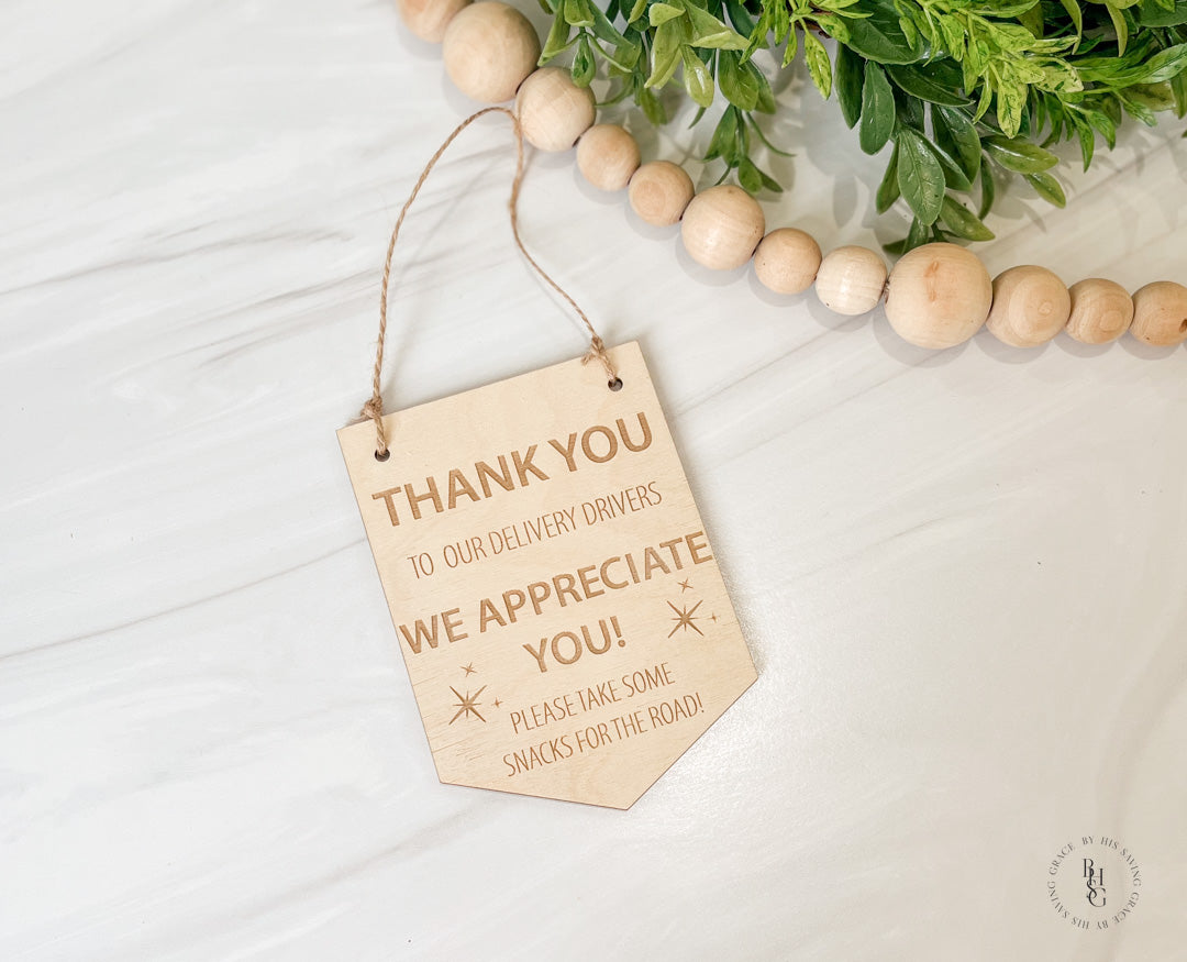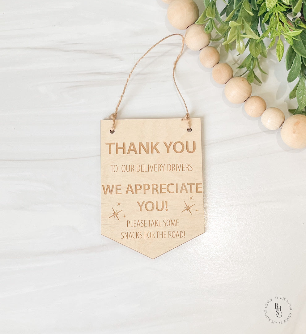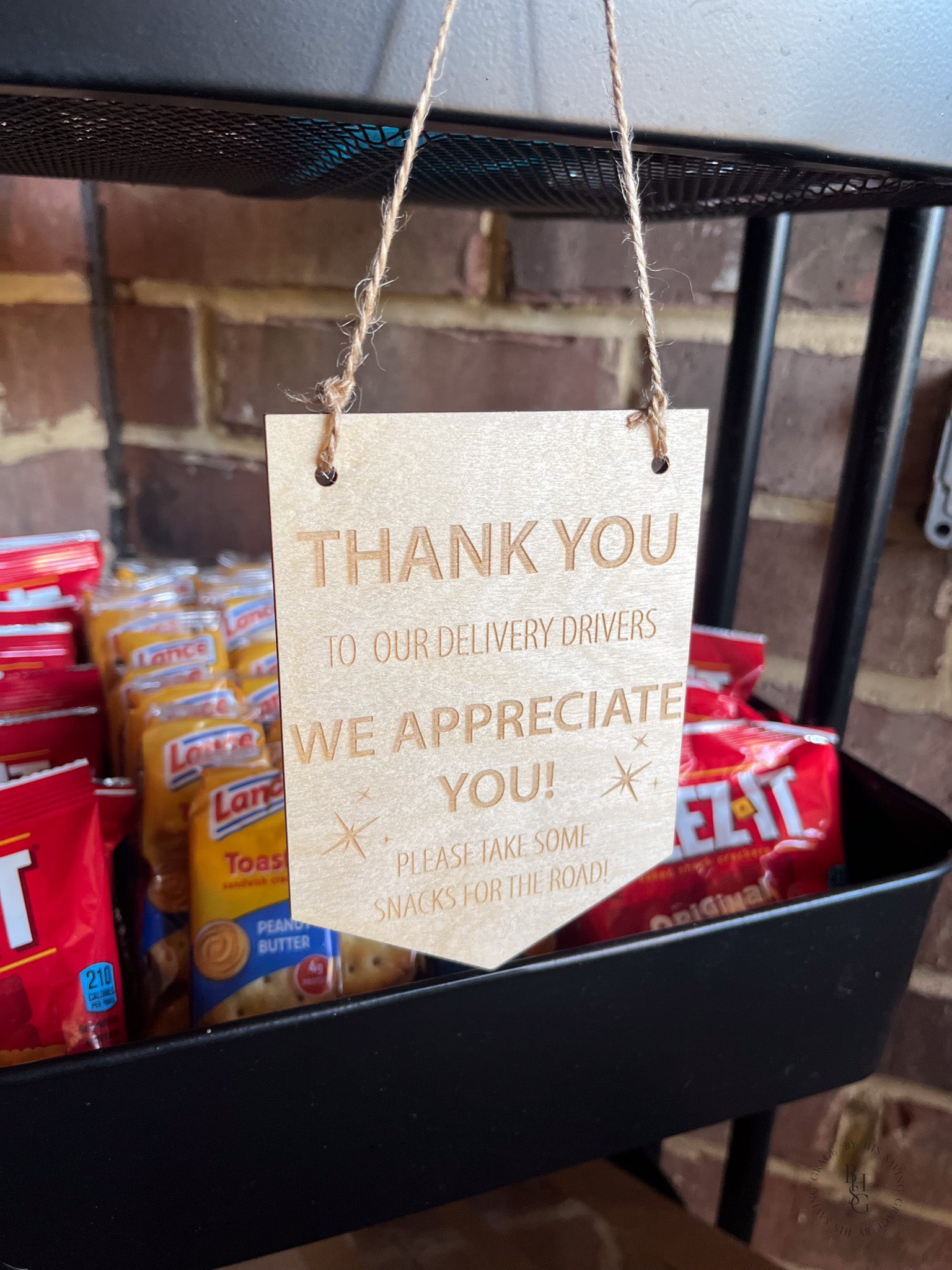 Our laser-cut and engraved "Thank You Delivery Drivers" sign. We all know how hard our delivery drivers work, and a little snack to thank them goes a long way. Add this adorable sign to let them know how thankful you are for them.