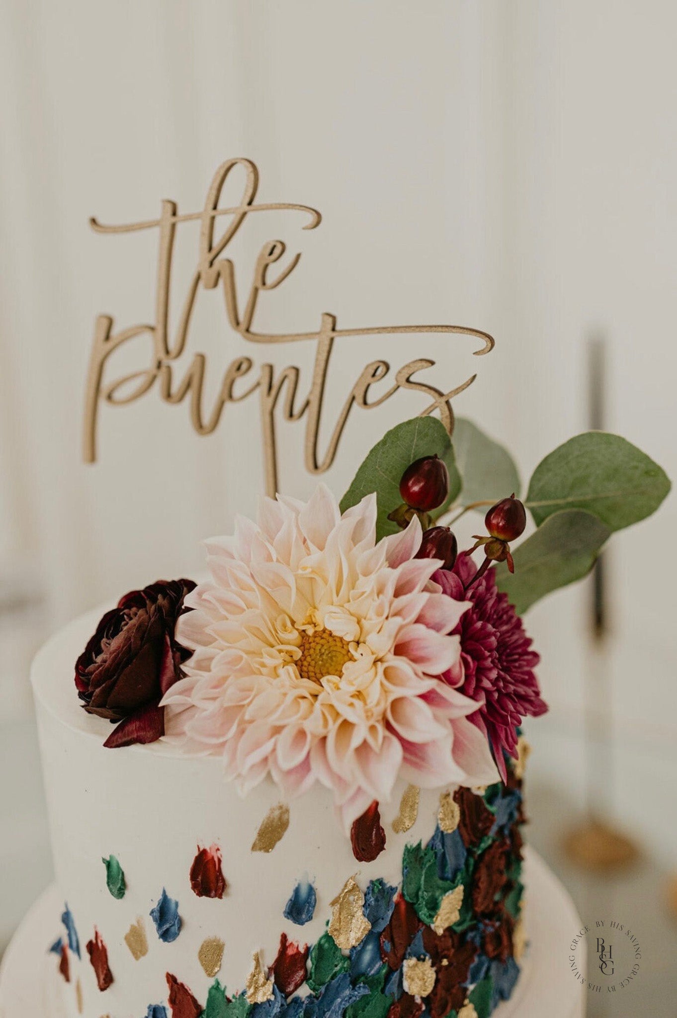 Our laser-cut The "Your Last Name" Cake Topper is the perfect touch to your beautiful cake! Color shown is metallic gold and both side of the cake topper will be painted.