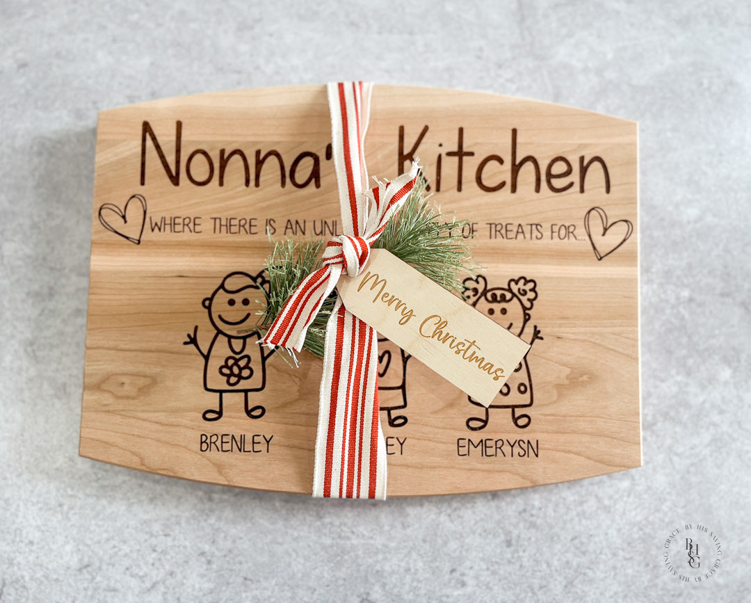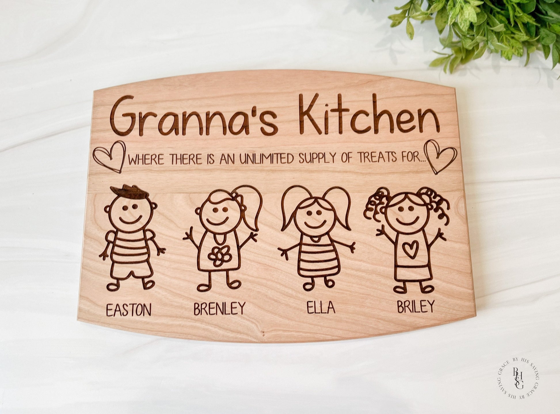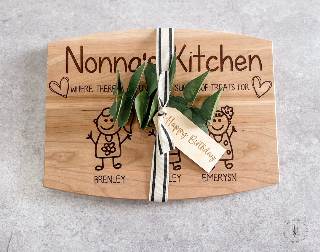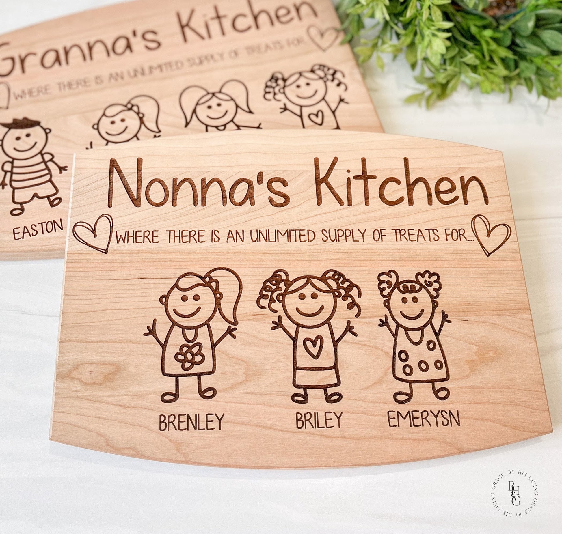 This laser-engraved cutting board is an excellent gift for grandma or mom! Personalize with the names of your choice to make the gift unique and one that will last for years to come!