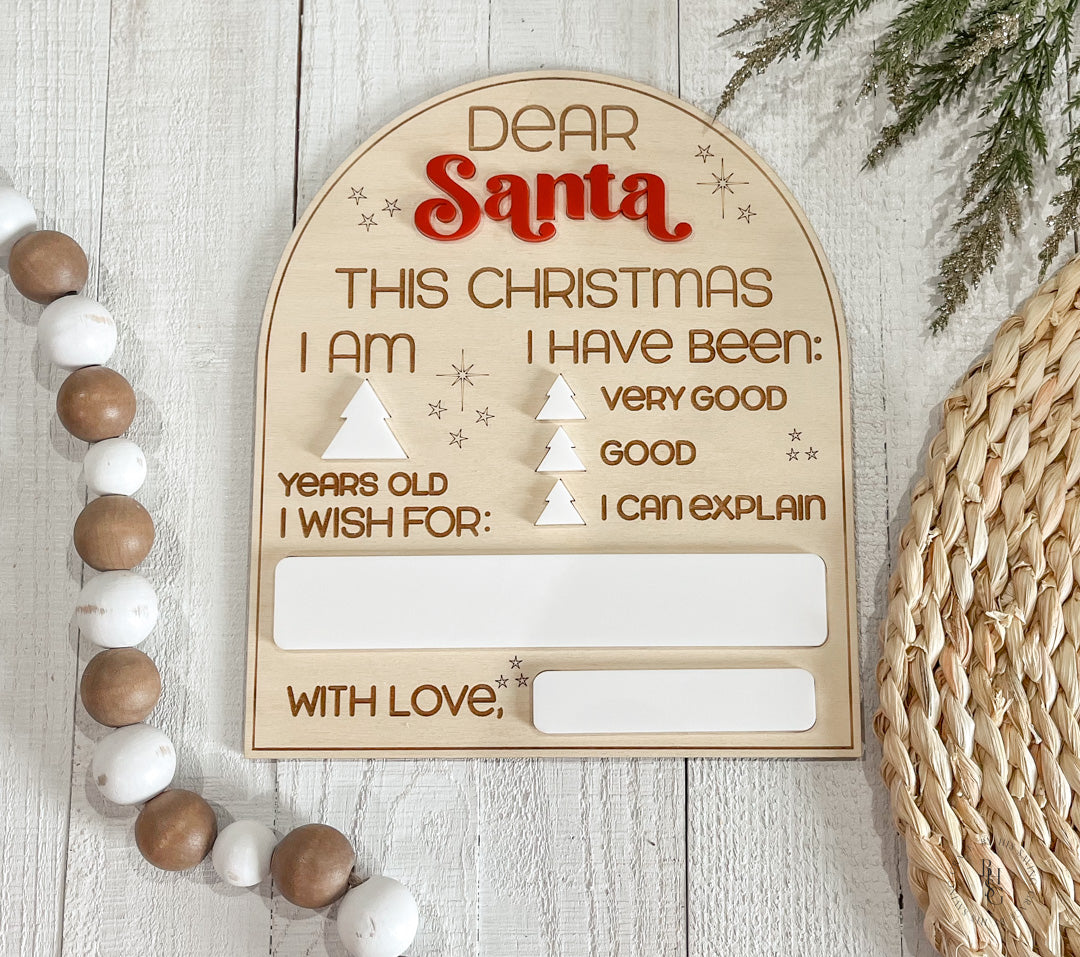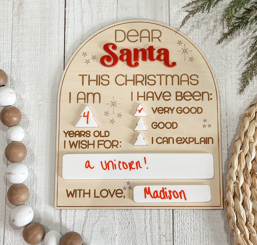This adorable, reusable Dear Santa Letter Board is the perfect way to keep track of your little one's Christmas wish list, and it can be used year after year! The sign features acrylic that doubles as a dry-erase board, making it reusable year after year! Write on the acrylic using expo markers and wipe off the acrylic with a damp cloth or dry-erase board cleaner when ready!