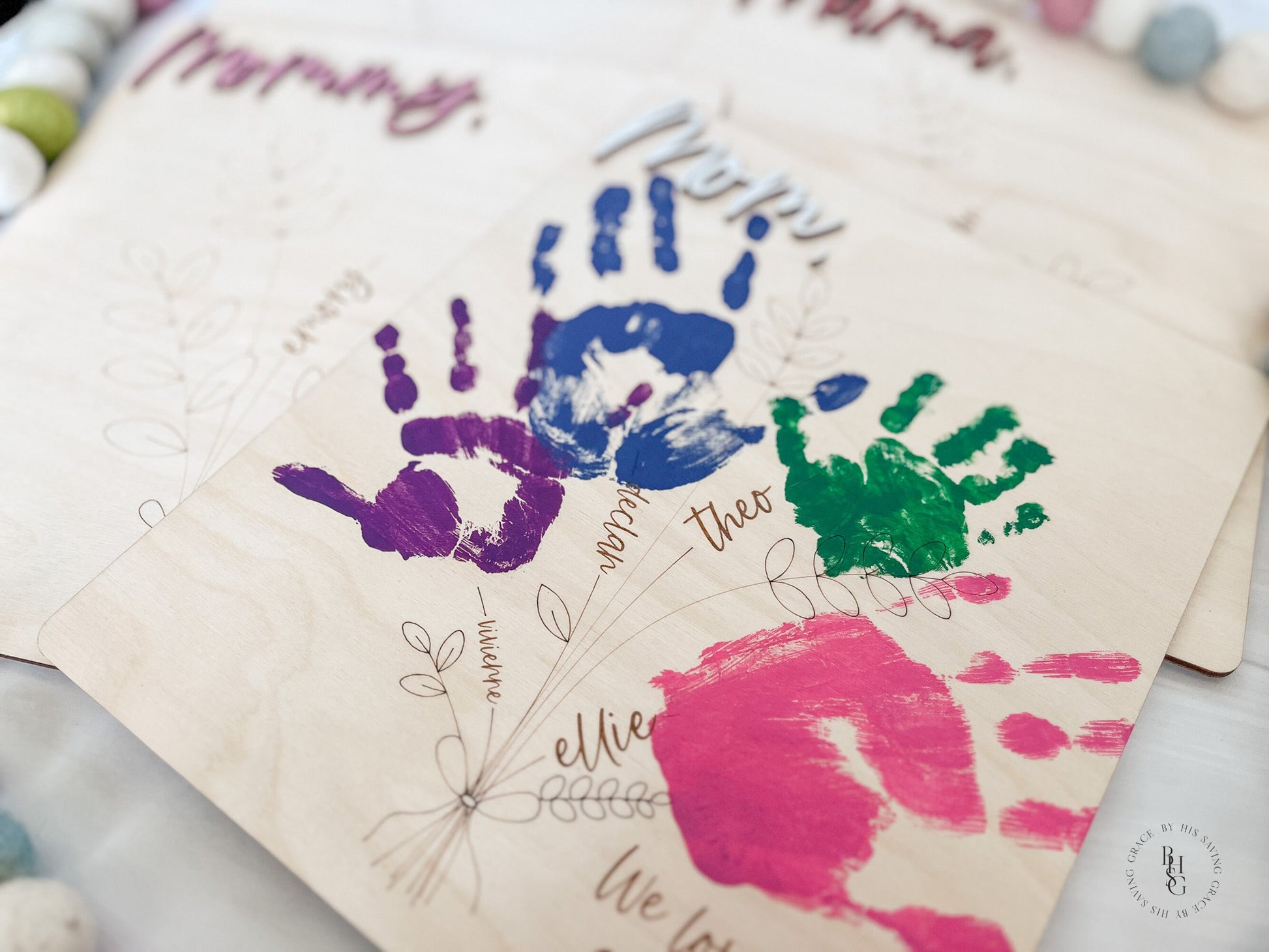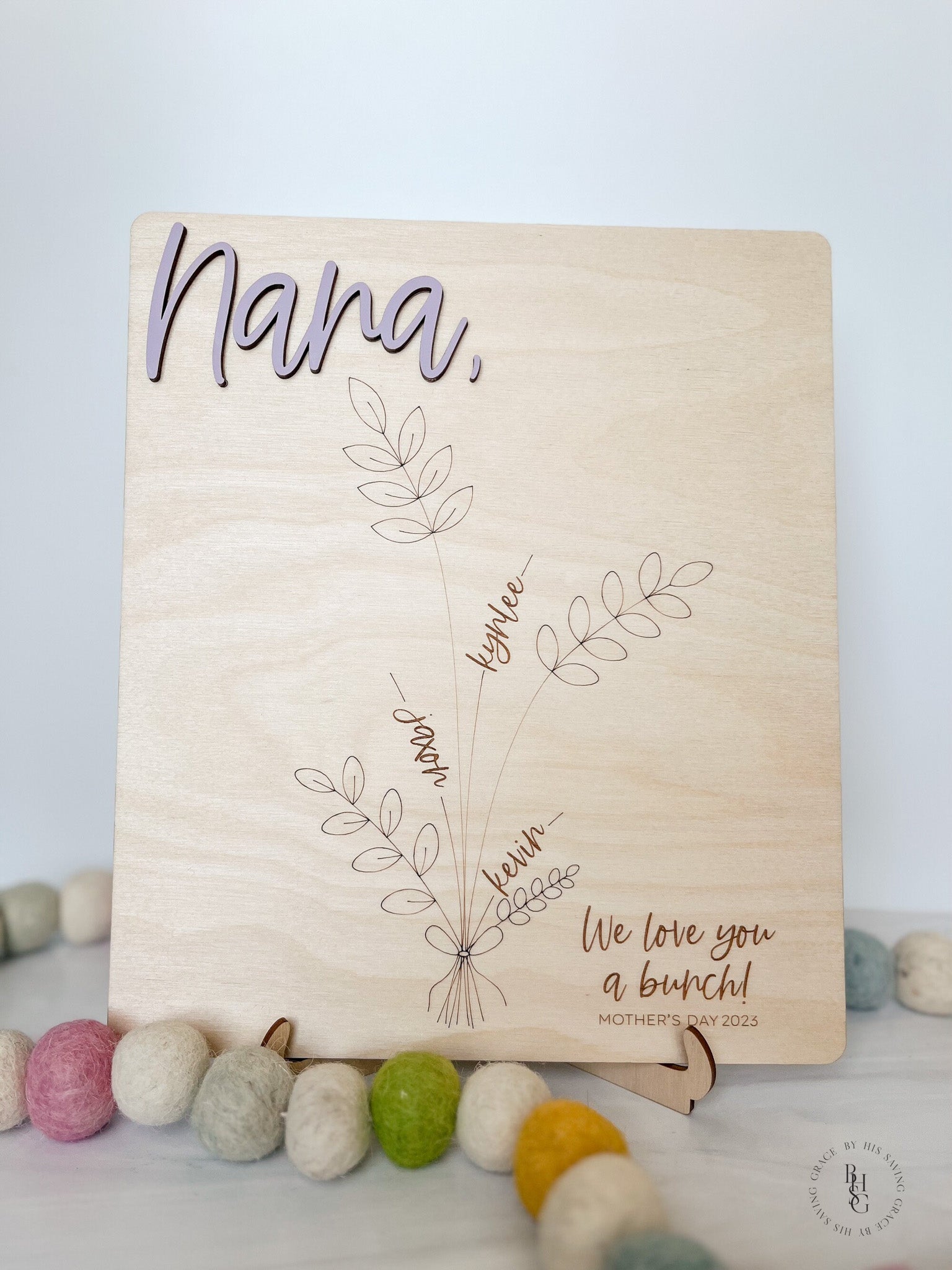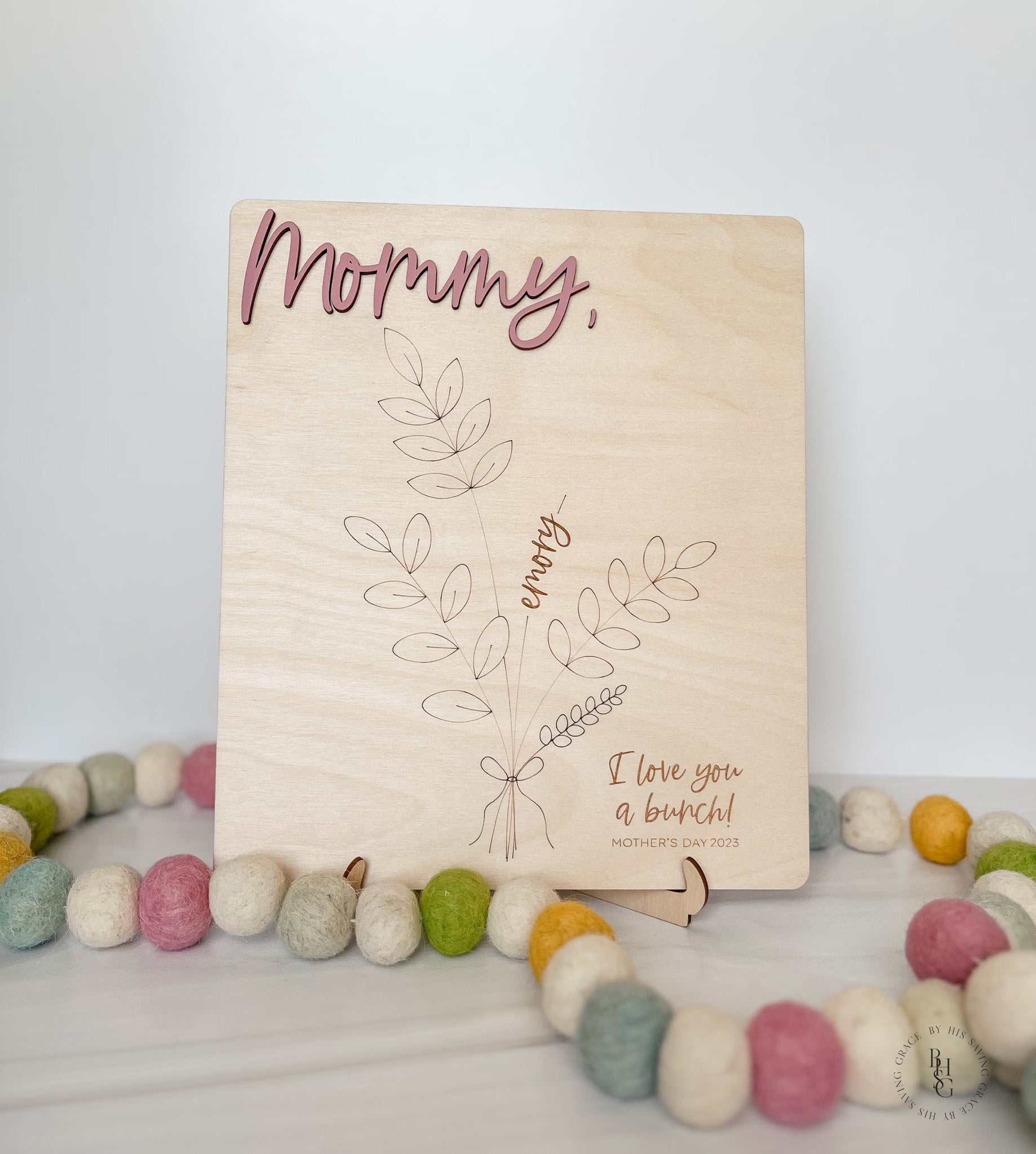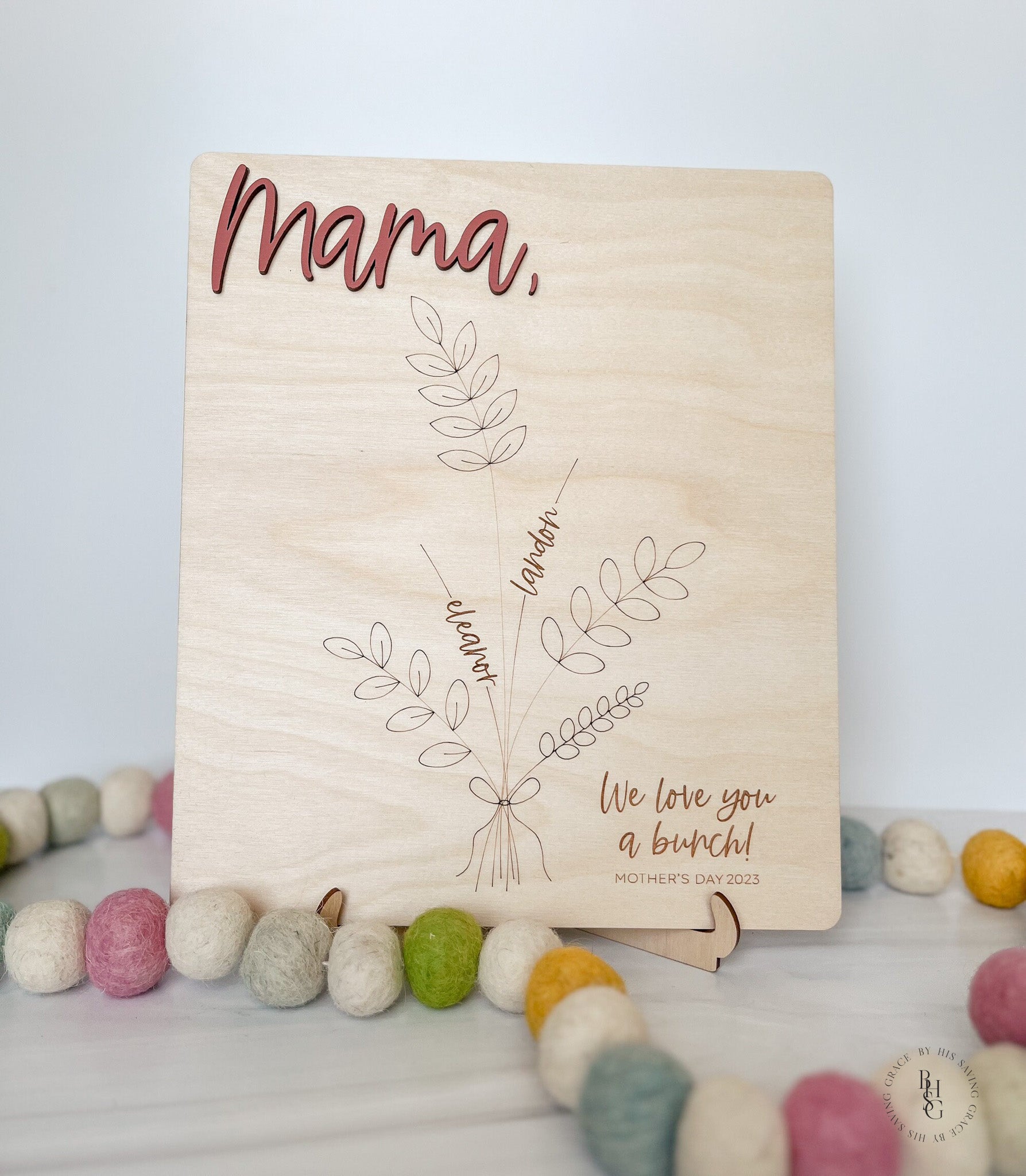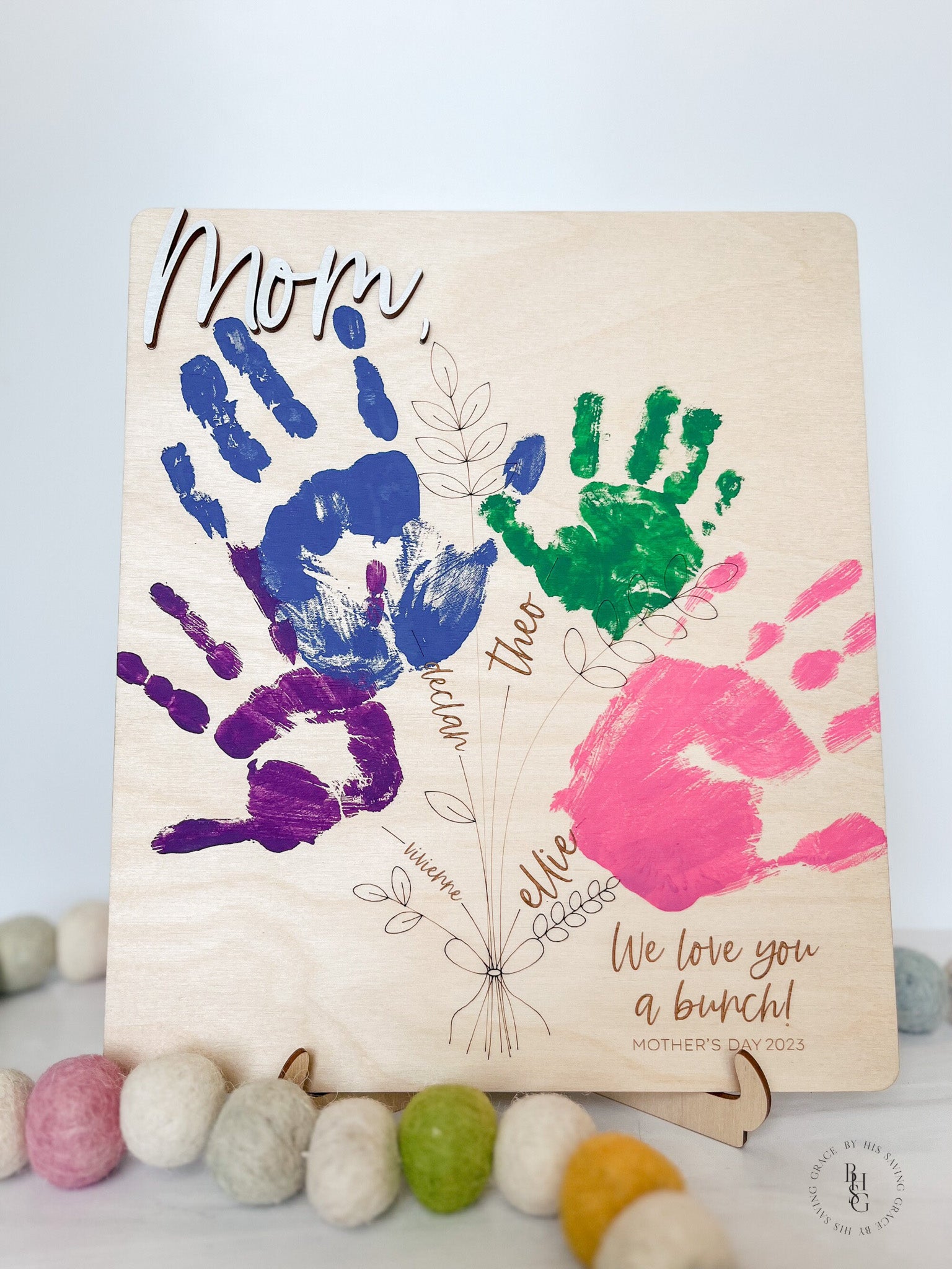 Our laser-cut and engraved handprint bouquet is a gift any mom would cherish for a lifetime. The wooden sign features 3D wooden letters and up to four spots for little hands to be added. A wooden stand is included to display the sign.