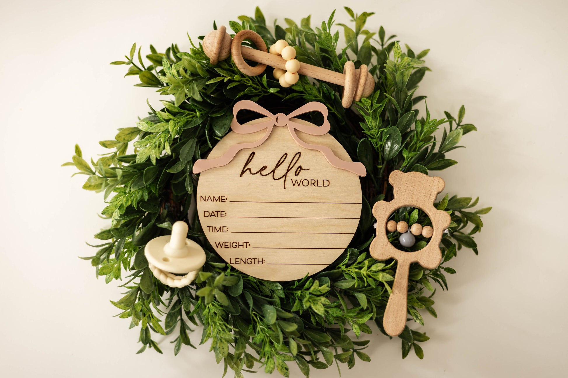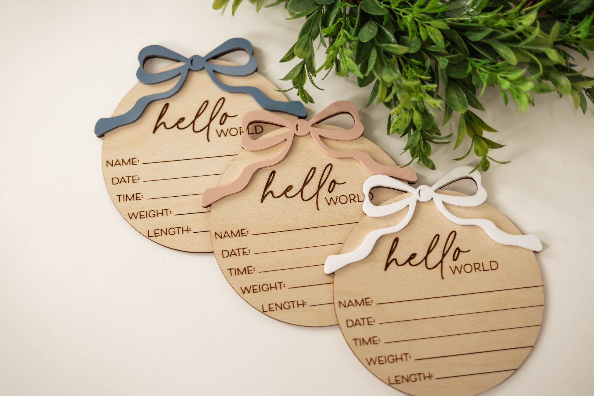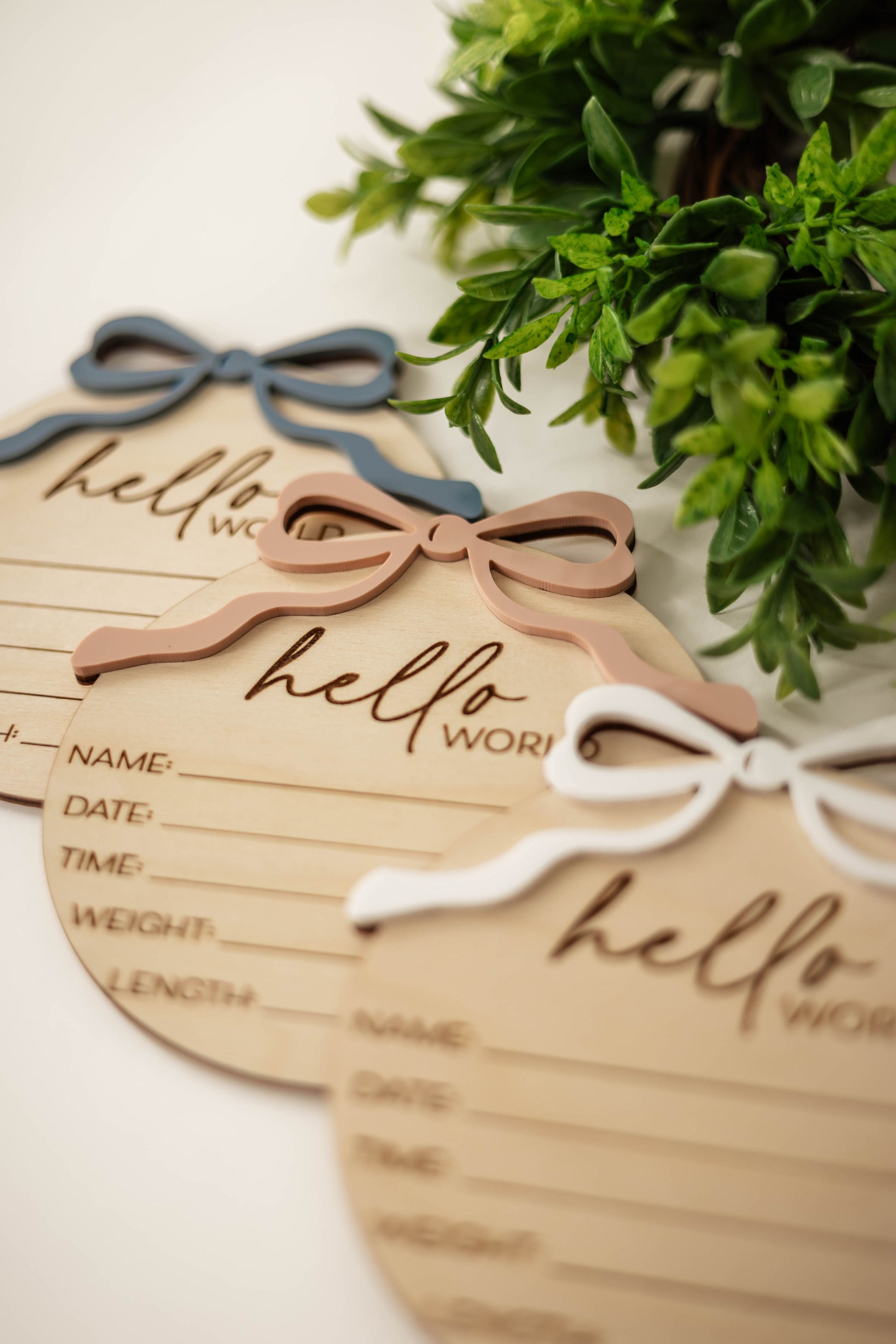 Wooden Hello World Baby Announcement Sign With Birth Stats and Acrylic Bow