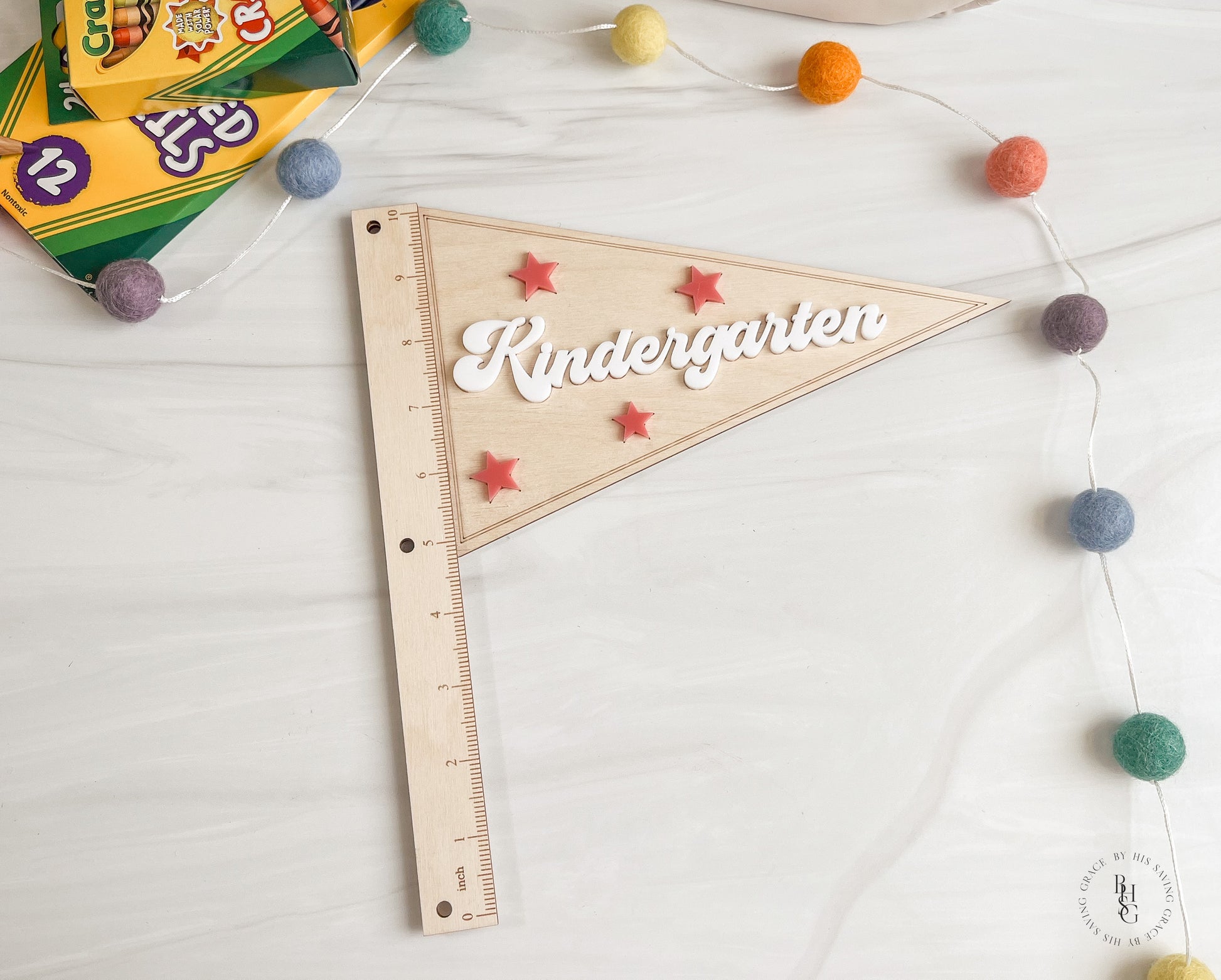 Our laser-cut and engraved pennant flag in your grade choice is a perfect prop to help capture those first and last days of school pictures.